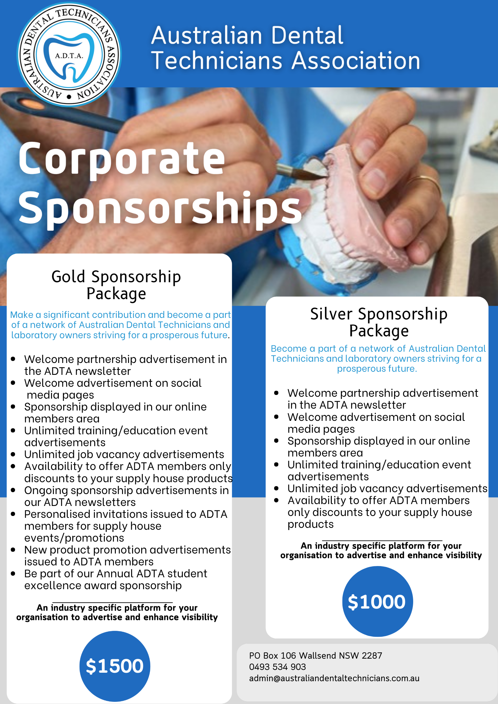 Silver Sponsorship Package $1000.00 Become a part of a network of Australian Dental Technicians and laboratory owners striving for a prosperous future.